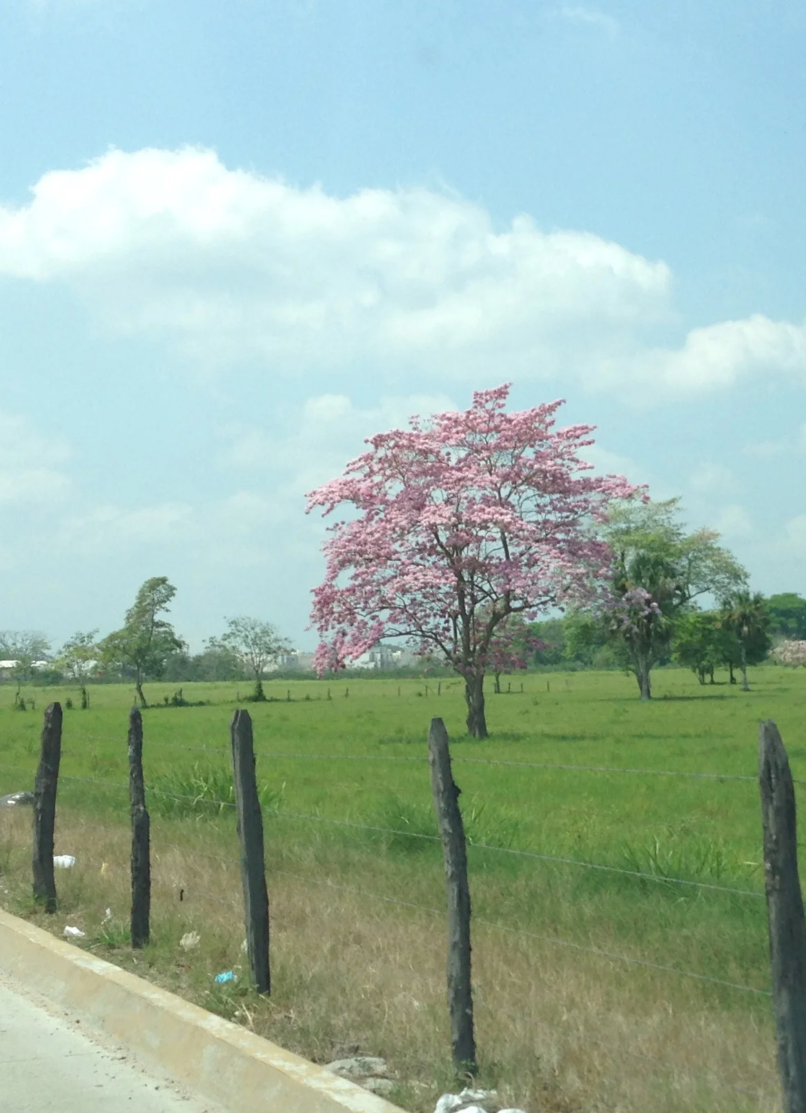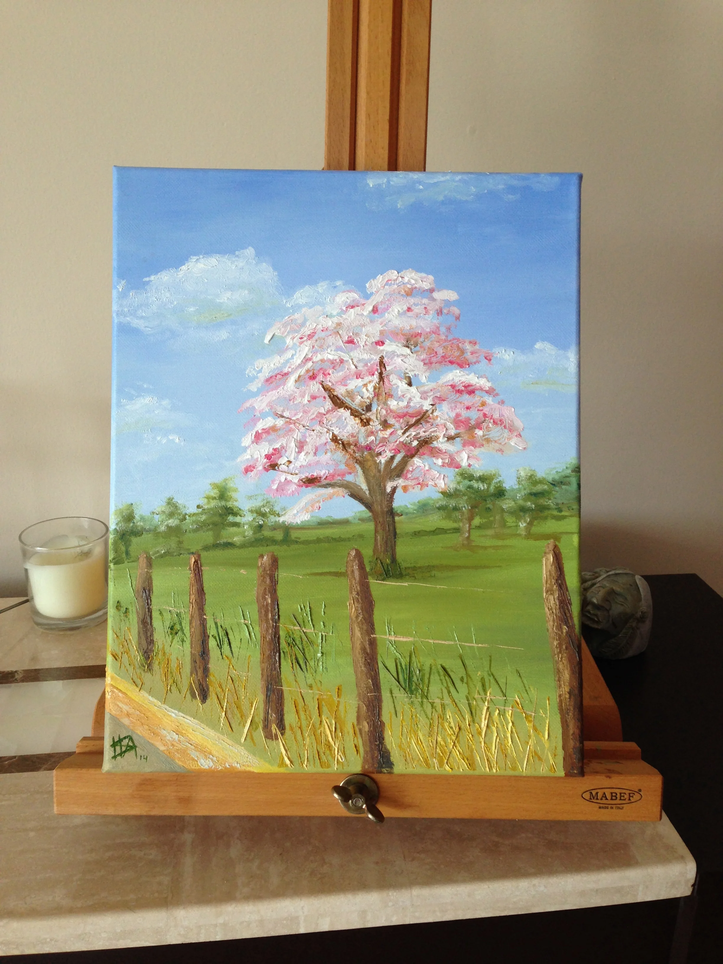 This tree I never even seen before even though I drive by it every day to take the kids to school. But one early morning there was this amazing tree in the field. Where did that come from? For two days I kept wanting to stop and take a picture. Well, that road is pretty busy and full of Mexican traffic, so I was a little worried to stop on the side of the road. I ended up doing a drive by picture taking as I drove with my phone. Safety aside, I really liked the picture and decided to us it to do my very first oil painting with it. The very next morning, on my way to school, the tree lost all its flowers. Now it is back to its invisibility among the green field it lives in.